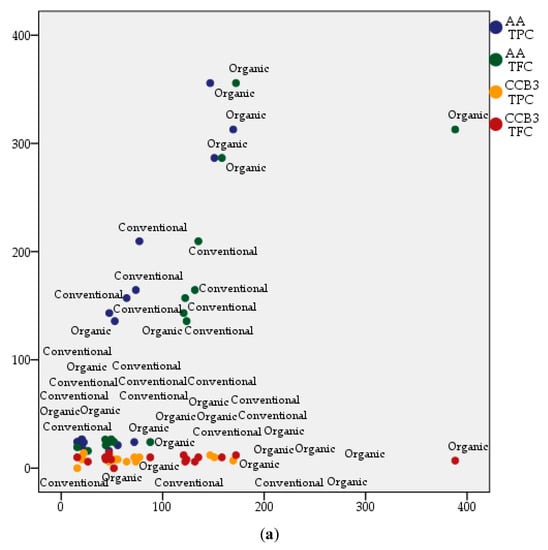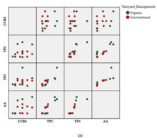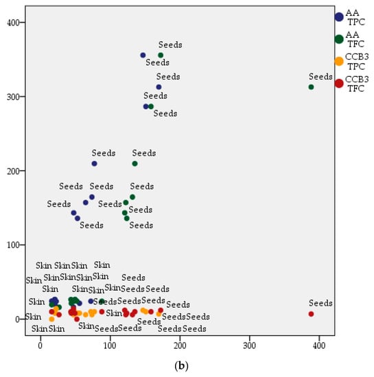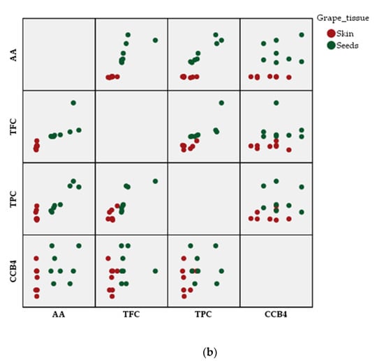 Figure 5 shows the correlation between TPC, TFC, AA, and antibacterial activity of the extracts against CCB4 strain, based on both management system (a) and grape berry tissue (b). The graphical representation reveals that most of the organic varieties and the seeds of the grapes are sources to be exploited in terms of compounds with antioxidant activity.