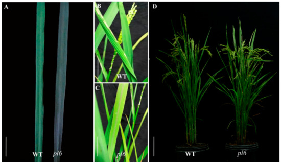 Morphological features of the wild type (WT) and pl6 mutant at different growth stages. (A) The leaf at the tillering stage, bar = 2 cm; (B,C) The leaves of WT and pl6 mutant at late Heading stage, respectively; bar = 5 cm; (D) The plant at late grain filling stage, Bar = 10 cm.