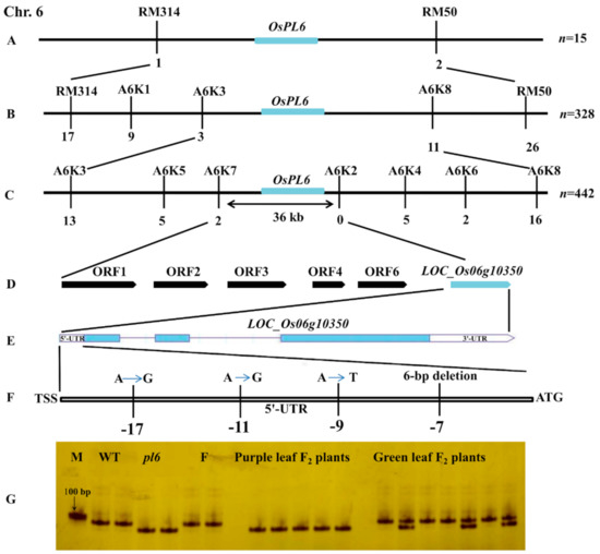 Plants from the F2 population developed by the crossing between pl6 and its WT, grown for genetic analysis, were visually counted. Their segregation ratio of the individuals with purple leaves and green leaves were analyzed in Microsoft Excel. The F2 population constructed by the crossing between pl6 and Zhenongda 104 (Oryza sativa L. ssp. japonica) were developed for the gene mapping. Firstly, the bulked segregating analysis was used for linkage analysis, where DNAs from 15 purple leaf and 15 green leaf individuals bulked into two DNA pools, and then those two DNA pools were screened with 300 polymorphic simple sequence repeats (SSRs), covering all the 12 rice chromosomes [18]. After finding candidate marker through bulk segregation analysis, primary mapping was performed, where 328 purple leaf F2 individuals were used and more InDel primers were designed to get the directions of the candidate region. After getting the directions of the candidate region, fine mapping was carried out to narrow down the candidate region by designing more InDel primers toward the candidate region using 442 individuals with purple leaf trait in the F2 population. Orthologous sequence differences between indica rice (Oryza sativa L.) and japonica rice (Oryza sativa L.) were exploited to design more polymorphic primers using DNASTAR Lasergene 14 (DNASTAR, Madinson, WI, USA) software and Primer premier 5.0 (PREMIER Biosoft, San Francisco, CA, USA) software. Functional annotations of the genes within the candidate region were explored from databases of RGAP (Rice Genome Annotation Project) [19]. The analysis of cis-acting elements in the promoter was discovered by following the ‘PLACE’ database [20]. The primers used for the gene mapping are listed in Table S1.