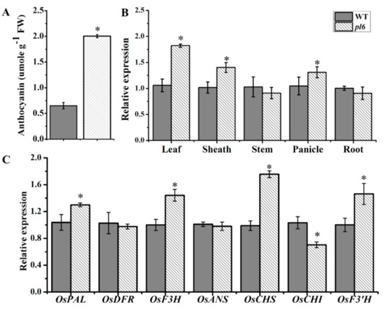 Estimation of anthocyanin contents, tissue-specific expression of OsPL6 gene and related gene expression at the tillering stage. (A) Anthocyanin contents in leaves of WT and pl6; (B) The expression pattern of OsPL6 gene in different organs; (C) The expression profile of anthocyanin biosynthesis pathway genes between WT and pl6 at grain filling stage. * p < 0.05 following Tukey’s test. All data represent the mean ± SD of three replicates.