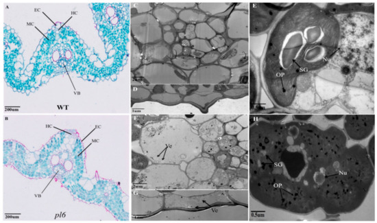 Transverse section and transmission electron microscopic images of the leaf blade between the WT and the pl6 mutant; (A,B) Transverse section of a leaf blade of WT and pl6 at the late tillering stage; (C,F) Transmission electron microscopic images of vascular cells at the late tillering stage, respectively; Bar = 2 μm; (D,G) Closed up images of epidermal cells, Bar = 1 μm; (E,H) Ultrastructure of mesophyll cells in the leaf of WT and pl6, Bar = 0.5 μm; MC, Mesophyll Cells; HC, Hypodermis cells; EC, Epidermal cells; VB, Vascular bundles; SG, Starch granules; OP, Osmophilic Plastoglobuli; Nu, Nucleous; Ve, Vesicles, respectively.