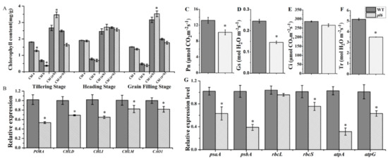 Photosynthetic pigment contents, photosynthetic parameters and the expression of relative genes between the WT and the pl6 mutant. (A) Pigment contents in leaves at the tillering and heading, grain filling stage; (B) The expression prototype of pigment metabolism genes at the late tillering stage; (C) Photosynthetic rate (Pn); (D) Stomatal conductance (Gs); (E) Intercellular CO2 concentration (Ci) and (F) transpiration rate (Tr); (G) Expression analysis of genes associated with photosynthesis. Asterisks indicate the statistical significance levels according to Tukey’s test: * p < 0.05. All values represent the mean ± SD of three replicates.
