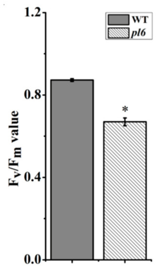 Chloroplast development and photosynthesis-related genes were also compared between pl6 and WT plants (Figure 5G). The transcription levels of rbcS (encoding the small sub-unit of Rubisco), psaA (encoding the reaction center protein A1 of photosystem I (PSI)), psbA (encoding the reaction center protein D1 of PSII), atpA (encoding the α subunit of ATP synthase), atpG (encoding the γ subunit of ATP synthase) were significantly down-regulated, while rbcL (encoding the large subunit of Rubisco) were not affected. The results indicate that OsPL6 influenced the chloroplast development and photosynthesis badly in pl6 mutant plants. For testing chlorophyll fluorescence, Fv/Fm (the maximal competence yield of PSII) was measured. The Fv/Fm was reduced in the pl6 mutant as compared to the WT, suggesting abnormal chlorophyll metabolism (Figure 6).