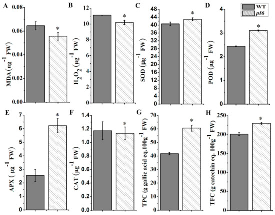 Antioxidant activity and oxidative damage between the WT and the pl6 mutant. (A) SOD (superoxide dismutase); (B) APX (ascorbate peroxidase); (C) POD (peroxidase); (D) CAT (catalase); (E) TFC (total flavonoid contents); (F) TPC (total phenolics content); (G) H2O2 hydrogen per oxide; (H) The MDA (malonaldehyde) contents. All values are mean ± SD of three biological repeats. * p < 0.05 followed by Tukey’s test.