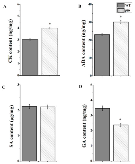 Detection of various phytohormones of the WT and the pl6 mutant. Cytokanin (CK) (A), abscisic acid (ABA) (B), salicylic acid (SA) (C) and gibberellic acid (GA) (D) content of the top of flag leaves at the late tillering stage. All values are the mean ± SD of three biological replications. * p < 0.05 by Tukey’s test.