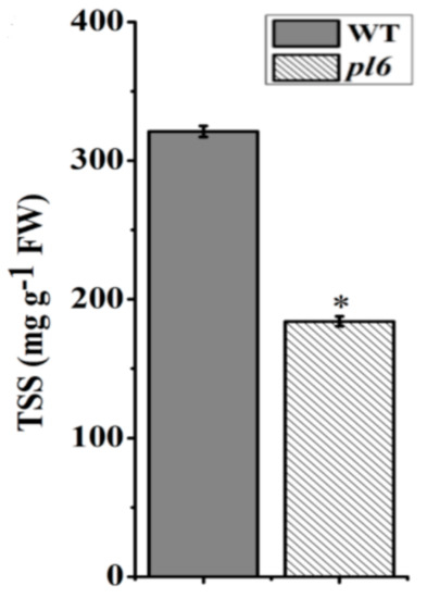 Detection of total soluble sugar (TSS) contents between the WT and the pl6 mutant at the late tillering stage. All values are the mean ± SD of three biological replications. * p < 0.05 by Tukey’s test.