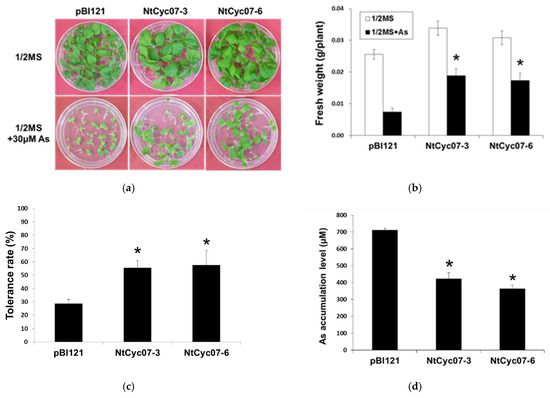 We have examined again As(III) tolerance and accumulation in a vector only expressing control (pBI121) and NtCyc07-overexpressing (NtCyc07-3 and NtCyc07-6) tobacco since we challenged plants with 30 µM As(III) which is higher than previously used 15 µM [34] to induce a remarkable difference in As(III) tolerance between control and transgenic plants. As shown in Figure 1a,b, NtCyc7-tobacco exhibited a higher tolerance to As(III) than control plants, and control and transgenic plants were healthy based on green colors/chlorophylls even with enhanced As(III) concentrations. In addition, As(III) accumulation was lower in NtCyc07-tobacco than in control plants (Figure 1c), suggesting that the higher As(III) tolerance in transgenic tobacco is ascribed to the reduced level of As(III).