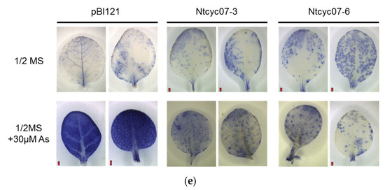Since As(III) treatments generally induce oxidative stress [47], we compared oxidative stress levels including hydrogen peroxide (H2O2), superoxide (O2−) and malondialdehyde (MDA, indicator of membrane oxidation) between control and NtCyc07-tobacco (Figure 3a–c). While levels of H2O2, superoxide and MDA were enhanced by As(III) in control tobacco, those were not altered in NtCyc07-tobacco, resulting in lower oxidative stress levels in transgenic tobacco than in control plants. In addition, levels of H2O2 and superoxide were visualized by DAB and NBT staining, respectively (Figure 3d,e). It also confirmed lower contents of H2O2 and superoxide in transgenic tobacco, compared with that of control plants. Considering the lower levels of As(III) and oxidative stress in NtCyc07-tobacco, the lower oxidative stress may be attributed to the lower As(III) level.
