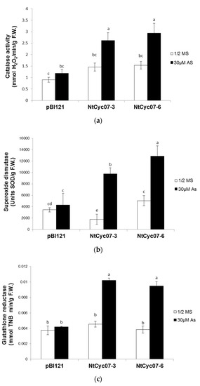 In general, antioxidant enzymes ameliorate oxidative stress; therefore, the activities of catalase (CAT), superoxide dismutase (SOD) and glutathione reductase (GR) were examined (Figure 4). While the activities of all three enzymes were enhanced by As(III) in NtCyc07-tobacco, those of control plants were not induced, leading to the higher activities of antioxidant enzymes in NtCyc07-tobacco than in control plants. Regarding the lower As(III) level and higher activities of antioxidant enzymes in NtCyc07-tobacco, the higher antioxidant enzyme activity may be ascribed to the lower content of As(III). However, it is also possible that the activity of antioxidant enzyme is enhanced by NtCyc07 itself, in addition to the lower As(III) content. Based on these results, it appears that the lower level of oxidative stress in NtCyc07-expressing tobacco under As(III) stress is ascribed to the higher activities of antioxidant enzymes and the lower level of As(III), when compared with control plants.