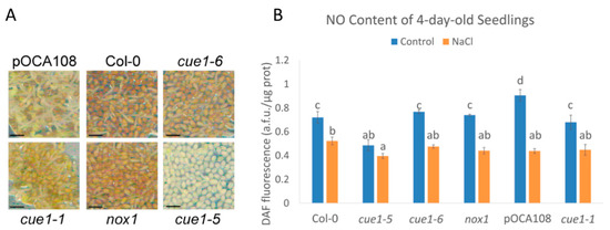 High salinity delays germination and impairs seedling establishment [52]. Endogenous NO is increased when plants are exposed to salt stress and might act as an antioxidant by quenching the ROS produced in response to salinity [53,54,55,56]. In order to see whether cue1 mutants would accumulate NO during salt stress, we indirectly quantified the NO content of 4-day-old seedlings grown on a medium supplemented with 100 mM NaCl through quantification of DAF fluorescence. This salt concentration was chosen because it has been previously shown that it is enough to cause salt stress to A. thaliana seedlings [53]. Under our growth conditions, the DAF fluorescence significantly decreased in all the examined lines after salt stress, suggesting an inability to overproduce NO at this stage (Figure 1). In this case, cue1-5 had 0.4 ± 0.02 a.f.u./μg protein, only 23% less than Col-0, which had 0.52 ± 0.03 a.f.u./μg protein. The rest of the lines had similar fluorescence levels to those of Col-0, ranging from 0.44 ± 0.02 a.f.u./μg protein to 0.47 ± 0.01 a.f.u./μg protein. The greatest decrease in the presence of high salinity was observed in pOCA108, which had 48% of the fluorescence intensity it accumulated in control conditions.