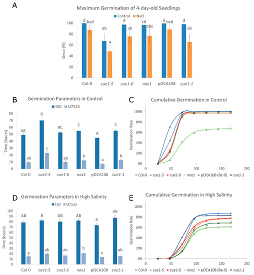 Given the role of NO in the promotion of seed germination [45], we decided to analyze the germination rate of the different cue1 alleles. While most of the Col-0, cue1-6, nox1-1, pOCA108, and cue1-1 seeds had fully germinated after 4 das (between 96.5% and 99.5% of the population), the maximum germination (Gmax) of cue1-5 was only 67%, in accordance with the decrease in DAF fluorescence and supporting a reduced NO content at this stage (Figure 2A). In the presence of high salinity, the germination of all the lines decreased consistently with a reduction in endogenous NO. This germination delay was especially apparent for cue1-5, which had a Gmax of 48% while the rest of the lines had similar Gmax that varied between 66% and 88% (Figure 2A). Despite the stark decrease in DAF fluorescence after salt stress (Figure 1), the germination of pOCA108 was almost unaffected by the stress, with only an 11% decrease in its germination rate with respect to control conditions.