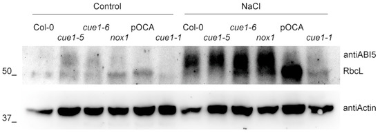 Figure 3. Germination inhibitor ABI5 is stabilized in cue1-5 and in the presence of salt stress. Western blot analysis of ABI5 accumulation in the different cue1 lines grown on MS with and without 100 mM NaCl for 4 das. Actin levels are shown as loading controls.