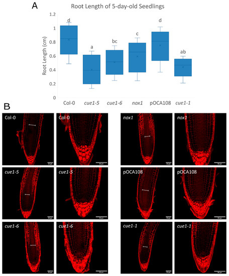 Studies carried out mainly with pharmacological NO donors and scavengers show that both excessive and insufficient NO result in the inhibition of root elongation [32,33,64,65]. Analysis of the root length of 5-day-old seedlings showed that all the cue1 mutants had shorter roots than their respective controls (Figure 4A). The root lengths of Col-0 and pOCA108 were equivalent (0.85 ± 0.04 cm and 0.77 ± 0.05 cm, respectively), despite their differences in DAF measurements of NO at 4 das. At the same time, the root lengths of cue1-6 and nox1 were 40% and 28% shorter than Col-0, respectively, even though both lines showed as much DAF fluorescence as Col-0. On the other hand, cue1-1 and cue1-5, the mutants that accumulated less NO according to the DAF measurements, also had the shortest primary roots.