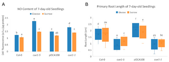 Figure 5. (A) The NO content of cue1 alleles depends on their developmental stage. DAF fluorescence intensity of extracts of 7-day-old seedlings grown on MS-Root medium supplemented with either 2%(w/v) glucose or 0.75%(w/v) sucrose. Values represent the mean ± CI (n = 4). A two-way ANOVA with post-hoc Tukey’s HSD test showed a statistically significant interaction between genotype and carbon source ((F(3,24) = 33.99, p < 0.001, eta2[g] = 0.81). An analysis of simple main effects for each factor was performed with statistical significance after a Bonferroni correction (Table S2). (B) Primary root length is influenced by NO and sugar. Primary root length of 7-day-old seedlings grown on MS-Root supplemented with either 2%(w/v) glucose or 0.75%(w/v) sucrose (n = 50). The diagram shows data between the lower (Q1) and upper (Q3) quartiles, the median and the mean (x) for each genotype. Common letters (a–f) indicate there are no significant statistical differences as determined by Welch’s one-way ANOVA with post-hoc Games–Howell test (F(7,571) = 203.57, p < 0.001).