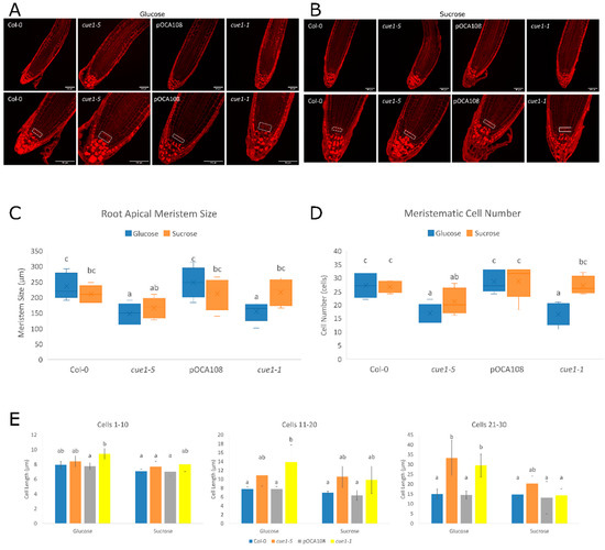 We also explored the primary root apical meristems of these roots to analyze meristematic cortical cell length, meristem size, and meristem cell number of the mutants (Figure 6, Table S1). Morphological observation showed that all the lines accumulated amyloplasts in the cortical and epidermal cells upwards of the transition zone when they were grown in the presence of glucose (Figure 6A), but not in the presence of sucrose, where only cue1-5 and cue1-1 accumulated them (Figure 6B). Furthermore, we noticed that the cue1 mutants presented amyloplasts in the columella stem cell layer, an indication of earlier differentiation. As described in [32], we observed disorganization of the cells surrounding the QC in some of the cue1-1 and cue1-5 plants, especially in the presence of glucose, where the endogenous NO levels were higher.