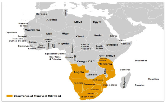 The tree occurs in several southern African countries including South Africa, the Kingdom of Eswatini (Swaziland), Botswana, Lesotho, Namibia, Mozambique, and Zimbabwe [17,18]. As shown in Figure 2, its distribution extends to other parts of tropical Africa. Mimusops zeyheri occurs in open, dry, and bushveld woodland [19,20]. It is suited for cultivation in low to medium-altitude areas of summer rainfall where frost is minimal or absent and can withstand various soil and climate conditions [21]. In larger gardens and open spaces, Mimusops zeyheri is easily cultivated and best used as a reliable shade and used as a shelter for birds and other animals [22]. Furthermore, Mimusops zeyheri can tolerate freezing without damage and it requires little maintenance (six or more hours of daily sunlight and a minimal amount of water to survive).