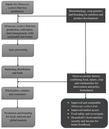 To unlock the potential of Mimusops zeyheri, an effective value chain highlighting the sequence and critical activities from the production to the marketing stage of the fruit tree and its product is proposed (Figure 3). The development of cultivation, preharvest, and postharvest protocols to enhance the production of indigenous plants for consumption will impact the four pillars of food security, namely access, supply, availability, and utilization, which is essential for a food secured country [47]. The key-players required for the value chain of Mimusops zeyheri will include a wide range of stakeholders such as farmers, transporters, wholesalers, and retailers as well as the consumers. Presently, the sales of Mimusops zeyheri serve as a marginal portion of livelihood among smallholder farmers who harvest from the wild population [36]. Rural communities with potential for cultivating this fruit tree are plagued with prevailing subsistence farming, perhaps due to poor financial strength or lack of essential farm inputs, which happens in a cyclical order and continually.