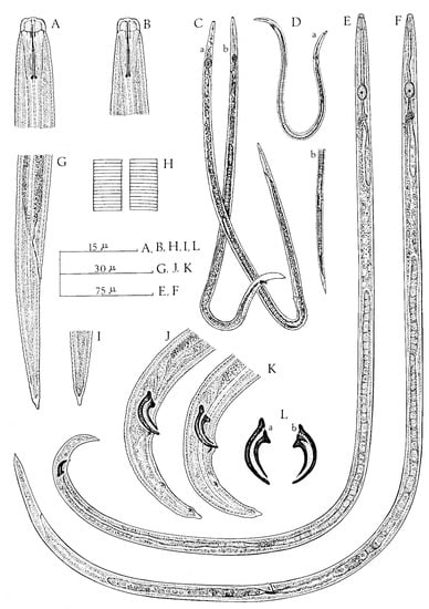 - McClure, M.A.; Stowell, L.J. A simple method of processing nematodes for electron microscopy. J. Nematol. 1978, 10, 376. [Google Scholar] [PubMed]