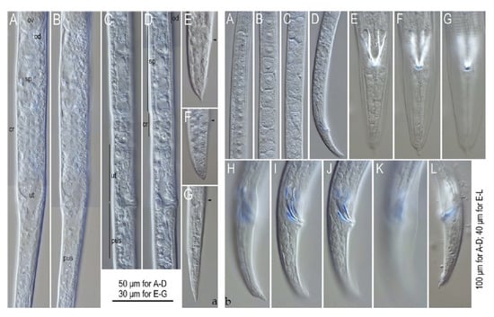 Males and Females of Litylenchus crenatae. (a) Female reproductive system and tail of Litylenchus crenatae; (A,B) posterior part of gonad of mature female in different focal planes; (C,D) posterior part of gonad of immature female in different focal planes; (E,F) tail of mature female; (G) tail of immature female. Ovary (ov), oviduct (od), spermatheca (sp), crustaformeria (cr), uterus (ut), and post-uterine sac (pus) are shown in (A–D), and anal opening is indicated by arrowheads in (E–G). (b) Male reproductive system of Litylenchus crenatae (A–K) are mature individuals, (L) is an immature individual. (A) Anterior end of testis; (B) middle part of mature testis; (C) posterior part of testis; (D) posterior end of testis and vas deferens; (E,G) ventral view of tail in different focal planes; (H,K) right lateral view of tail in different focal planes; (L) left lateral view of tail of immature individual. After Kanzaki et al. [32]. Courtesy of Nematology.