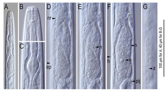 Anterior region of mature adults of Litylenchus crenatae; (A) anterior end to pharyngo-intestinal junction; (B) lip region; (C) metacorpus (median bulb); (D–G) pharyngeal gland region in different focal planes. Nerve ring (nr), excretory pore (ep), pharyngeal gland nuclei (n), hemizonid (h), pharyngo-intestinal junction (pij) and deirid (d) are indicated in (D–G) after Kanzaki et al. [37]. Courtesy of Nematology.