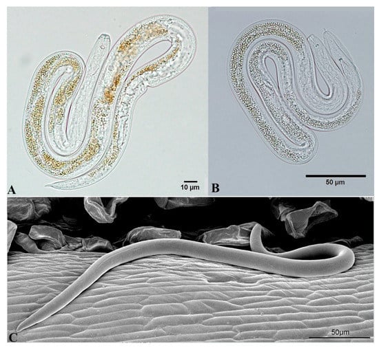 Males and Females of Litylenchus crenatae mccannii. (A) Mature Female; (B) male; (C) LT-SEM of young Female. Courtesy of Gary Bauchan and Shiguang Li of Electron and Confocal Microscopy and Mycology and Nematology Genetic Diversity and Biology Laboratory (MNGDBL), USDA, ARS, Beltsville, MD, respectively.