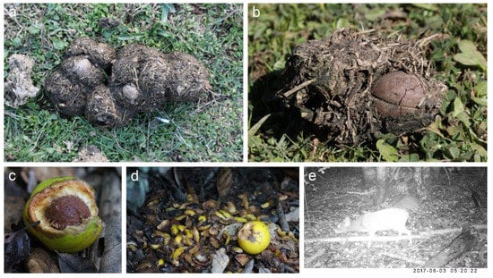 - Feer, F. Morphology of fruits dispersed by African forest elephants. Afr. J. Ecol. 1995, 33, 279–284. [Google Scholar] [CrossRef]