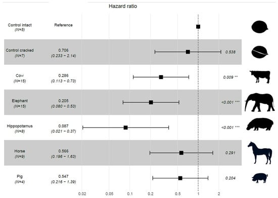 3.3. Can the Seed of G. keule Be Dispersed by Present-Day Large Animals?