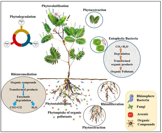 Environmental contaminate removal from polluted water, sludge, soil, and sediments using plants is known as phytoremediation [21]. For the past two decades, phytoremediation has been developed as a green, non-invasive, and economic alternative to different conventional civil engineering-based strategies for the remediation of water, soil, and even residences contaminated with heavy metals [22,23]. Strategies employed under phytoremediation have included phytodegradation (employing plants or microorganisms to degrade contaminants) [24,25,26], phytoaccumulation (employing algae or plants to accumulate contaminants in their areal parts) [27], phytostabilization (employing plants to reduce the heavy metal mobility in soil) [28], phytofiltration (employing plants’ biomass and their associated rhizospheric microorganisms to refine contaminants) [27], phytovolatilization (employing plants to absorb contaminants and transpire them into the atmosphere in the volatile shape) [29], and rhizodegradation (employing plants to degrade contaminants using rhizosphere microbes’ mediation [30,31,32] (Figure 1).
