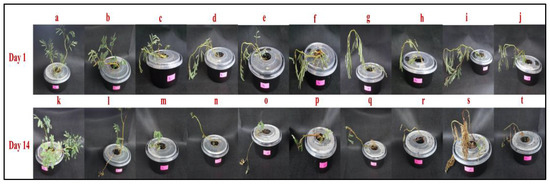 Exposure of water mimosas to different concentrations of arsenic (control, 5, 10, 30, 50, 60, 70, 80, 90, and 100 ppm). A total of 20 tanks were used, and plants were distributed in 3 experimental blocks (10 arsenic concentrations × 3 replications). Each tank (12 × 25 × 10 cm = 3 L) contained a single plant. The control and treated plants were kept at 18–25°C with an 18 h light/6 h dark photoperiod under a light intensity of 500 µmol·m−2 for two weeks. The data were collected on the 1st and 14th days. Morphological analysis showed that water mimosas were resistant to low levels of arsenic concentrations (less than 60 ppm). At higher arsenic concentrations, the morphological analysis showed severe symptoms of damage, and ultimately, death of the plant. Collected qualitative and quantitative data confirmed the negative impact of arsenic when its concentrations and time of treatment were increased. Day 1, control = a, 5 pp = b, 10 pp = c, 30 pp = d, 50 ppm = e, 60 ppm = f, 70 ppm = g, 80 ppm = h, 90 ppm = i, and 100 ppm = j. Day 14, control = k, 5 pp = l, 10 pp = m, 30 pp = n, 50 ppm = o, 60 ppm = p, 70 ppm = q, 80 ppm = r, 90 ppm = s, and 100 ppm = t.