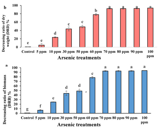 (a) Decreasing ratio of biomass (DRB) (%) and (b) decreasing ratio of dry weight (DRD) (%) of water mimosas two weeks after treatment in different arsenic concentrations (0, 5, 10, 30, 50, 60, 70, 80, 90, and 100 ppm). Fresh and dry weight of plants were measured on the 1st and 14th days. One-way ANOVA was performed, and bars represent standard errors (SE) of the means of the treatments (n = 3) with the same species, if not otherwise stated. Different letters indicate significant differences between arsenic concentrations according to Duncan’s multiple range test (p ≤ 0.05).