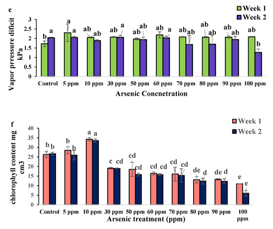 (a) Photosynthesis rate (µmol CO2 m−2·s−1); (b) Stomatal conductance (mol H2O m−2·s−1); (c) Intercellular CO2 concentration (µmol CO2 mol−1); (d) Transpiration rate (mmol H2O m−2·s−1); (e) air pressure deficit (kPa); and (f) Chlorophyll content (mg/cm3), of water mimosas one and two weeks after arsenic treatment at different concentrations (0, 5, 10, 30, 50, 60, 70, 80, 90, and 100 ppm). One-way ANOVA was performed, and bars represent standard errors (SE) of the means of the treatments (n = 3) with the same species if not otherwise stated. Different letters indicate significant differences between arsenic concentrations according to Duncan’s multiple range tests (p ≤ 0.01). Among the treatments, different letters indicate significant differences according to Duncan’s multiple range test (p ≤ 0.05).