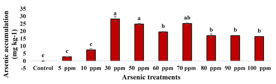 After one month of acclimatization, each plant was exposed to different levels of sodium heptahydrate arsenate (Na2HAsO4·7H2O) concentrations as follows: 0 (control), 5 (67), 10 (135), 30 (400), 50 (667), 60 (801) 70 (933), 80 (1067), 90 (1200), and 100 (1335) ppm (µM), and the treated plants were kept, for two weeks, at 18–25 °C with an 18 h light/6 h dark photoperiod under a light intensity of 500 µmol·m−2.