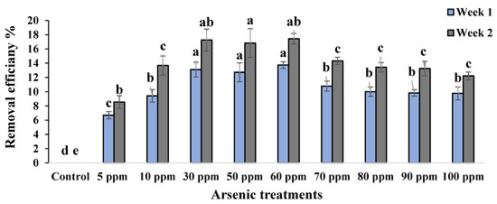 Removal efficiency (%) of water mimosas two weeks after arsenic treatments in different concentrations (0, 5, 10, 30, 50, 60, 70, 80, 90, and 100 ppm). One-way ANOVA was performed, and bars represent standard errors (SE) of the means of the treatments (n = 3) with the same species if not otherwise stated. Different letters indicate significant differences between arsenic concentrations according to Duncan’s multiple range tests (p ≤ 0.01). Among the treatments, different letters indicate significant differences according to Duncan’s multiple range tests (p ≤ 0.05).