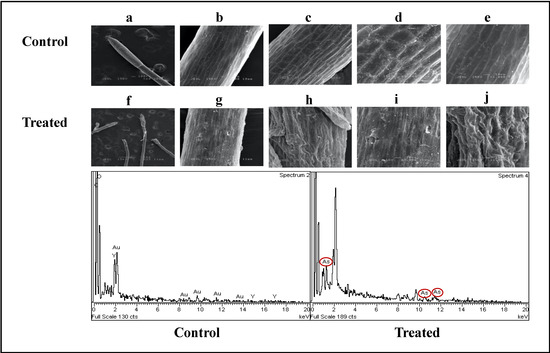 X-ray spectroscopy (EDX) (LEO 1455 VPSEM, London, UK) and scanning electron microscopy (SEM) observations were done on the roots of the control and 30 ppm treated water mimosas after 14 days of treatment (Figure 8). The roots of the control plants were thinner than the roots of plants treated with arsenic (woody roots). The hairy roots of the control samples were thinner and young (Figure 8a), but the hairy roots of treated samples were woody and thick (Figure 8f). The epidermis of both control and treated samples was multi-layered. There were several parenchyma tissues with a rectangular structure in the control samples (Figure 8b–d). However, the parenchyma tissues had an irregular structure in the treated samples (Figure 8f–i). In the control samples, the cortex (outer layer of plant’s root) generated circular intercellular nodules on its parenchyma cells. As compared with the control plants, the cortex of the treated samples were composed of irregular intercellular nodules on its parenchyma cells (Figure 8). The SEM analysis also proved the availability of arsenic in treated samples as compared with the controls (Figure 8j). The scanning electron microscopic analysis of Mimosa calodendron under arsenic treatment showed dissimilar changes in cell size. Arsenic can make visible changes to cell volume. This significant increase in the volume of the cell could be interpreted as a possible defence mechanism of the cell to avoid damage from arsenic toxicities through increasing arsenic acclamation [86].
