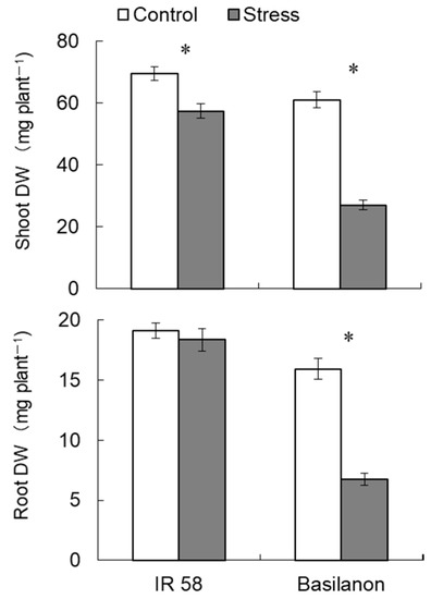 Shoot and root dry matter production of two rice cultivars in response to osmotic stress. Shoots and roots were sampled after 7 days (168 h) of treatment. Bars indicate the standard error (n = 12). Asterisks represent significant differences between treatments (p < 0.05, t-test).