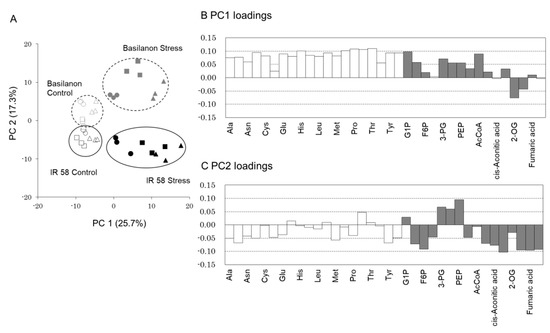 PCA scores also indicated differences between cultivars and treatments (Figure 2A). The first principal component (PC1) explained 25.7% of the total variability, and clearly separated the stress treatment on the positive side from the control on the negative side. The PC1 score became positive as the stress period increased. PC2 explained 17.3% of the variability and separated the cultivars, placing Basilanon on the positive side and IR 58 on the negative side. In IR 58, the PC2 scores were comparable between treatments, whereas the score was higher in the stress treatment for Basilanon.