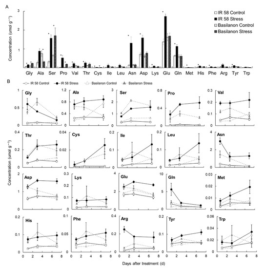 Since the observed increases in the levels of amino acids under stress were remarkable, we investigated the abundances of proteinogenic amino acids to determine whether they changed during osmotic stress. The concentrations of glycine (Gly), serine (Ser), proline (Pro), and cysteine (Cys) were significantly increased by stress treatments regardless of cultivar (Figure 3A). In addition to these amino acids, valine (Val), threonine (Thr), asparagine (Asn), aspartic acid (Asp), lysine (Lys), glutamic acid (Glu), glutamine (Gln), methionine (Met), histidine (His), phenylalanine (Phe), and tyrosine (Tyr) were significantly increased by the stress treatment in the IR 58 roots. Changes in amino acid concentrations during stress varied by amino acid and cultivar. (Figure 3B). In general, the levels of amino acids in the stressed condition were higher than those in the control. Amino acids, such as Gly and Asn, were higher in the early stages and decreased gradually, while others, such as Ser, Thr and Cys, increased and maintained a higher level than the control during the entire stress period. The amino acid concentrations in roots under stress were generally higher in IR58 than in Basilanon, with some exceptions, such as Ser and Gly.