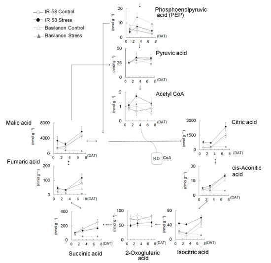 As we found cultivar differences in the abundance of TCA cycle metabolites (Figure 2C, Table 3), we further investigated the changes in the metabolites in the TCA cycle and its upstream metabolites in the roots (Figure 4). As shown in Table 3, the abundance of phosphoenolpyruvic acid (PEP) under stress was larger than that of the control in Basilanon roots, and this trend started at 3 days after treatment (DAT). There was no clear difference in the amount of pyruvic acid among cultivars or treatments. Acetyl CoA increased with stress at 3DAT in IR 58 and then decreased to a level comparable to that of the control at 7DAT. The amount of acetyl CoA in Basilanon at 7DAT was higher than that in the control. Interestingly, IR 58 and Basilanon exhibited clearly different metabolic responses to stress in terms of the metabolites generated after entering the TCA cycle under stress. For most of the metabolites in the TCA cycle, IR 58 control and stress treatments and the Basilanon control treatment exhibited similar changes in the amount by which the levels of these metabolites increased between 3DAT and 7DAT, except for 2-oxoglutaric acid (2OG), whereas these metabolites remained low in the roots under stress. Thus, the cultivar difference in response to stress in the TCA cycle was distinct from that of glycolysis. Citric acid synthase (CS) activity, which catalyzes the conversion of acetyl-CoA and oxaloacetate into citrate and H-SCoA, was determined (Figure 5). The CS activities per unit of fresh roots were comparable between both cultivars in the control. The activity significantly increased with stress in IR 58, whereas there was no significant change in stressed Basilanon.