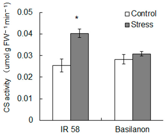 Respiration synthesizes ATP during the oxidation of carbon compounds and generates energy necessary for biological activities. In this study, we found an interesting cultivar difference through the pathway from sugar to glycolysis and then to the TCA cycle. In the glycolytic pathway, there was no clear difference in response to stress in either cultivar; however, stress decreased the levels of metabolites from the initial steps in the TCA cycle in Basilanon, whereas those of IR 58 were comparable with those of the control (Figure 4, Table 3). Therefore, we focused on the activity of CS, which catalyzes citrate from acetyl CoA and oxaloacetate, because its activity may have differed between cultivars. Our results show that CS activity in IR 58 was significantly higher under stress than under control conditions (Figure 5). CS activity is the limiting factor of the first step of the TCA cycle; thus, our results suggest that the root system of IR 58 maintained the TCA cycle by up-regulating CS activity, thereby generating energy for growth under stress. In addition to the above pathway, pyruvate dehydrogenase complex (PDC), PEP carboxylase, pyruvate carboxylase, and malate dehydrogenase are involved in the metabolism of substances entering the TCA cycle. We did not measure the activity of these enzymes in this study, but the activities of relevant enzymes may explain the high accumulation of PEP in Basilanon roots under stress. It has been reported that sucrose accumulated and organic acids in TCA cycle metabolic intermediates decreased under high-temperature stress in mature kernels of rice [7]. Metabolites representative of glycolysis and the TCA cycle, such as malate, glyceric acid, and glyceric acid-3-phosphate, were reduced at the tillering stage at the end of the dry-down treatment [8]. They also found that the root metabolites representative of glycolysis and the TCA cycle were largely reduced in the aus-type rice variety “N22”, which showed the least root elongation and highest reduction in root fresh weight under drought stress. Therefore, we suggest that the enzyme activity relevant to glycolysis and the TCA cycle may be reflected in a cultivar difference in root development under stress conditions.