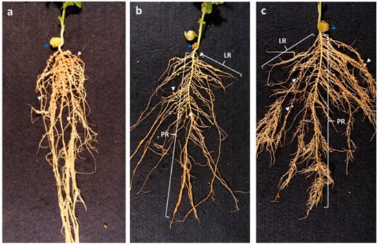 The root phenotypes of the different pea lines inoculated with Rhizobium leguminosarum. The images are of roots of wild-type (WT) (a), E107 (b), and E132 (c) harvested 42 days after inoculation. Lateral roots (LR) from the mutants have been pulled away from the primary root (PR) so that nodules (white arrowheads) could be easily distinguished. The blue arrowheads point at the shriveled cotyledons.