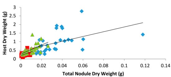Relationships of host dry weight and nodule dry weight in the different pea lines; WT plants are represented by blue diamonds, E107 plants by red squares, and E132 plants by green triangles. Plants were harvested throughout their development (at 14, 21, 38, 35, and 42 DAI), and data from all ages were taken into consideration (i.e., n = at least 24 for each pea line) to perform the regression analysis.