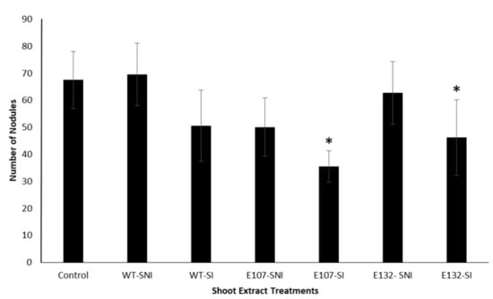 The effect of shoot extracts on WT nodulation. Inoculated WT plants were treated with the extracts derived from shoots of WT, E107, or E132 plants, inoculated (SI) or not (SNI) with rhizobia. Water was used as the control treatment. Nodules were counted at 21 DAI. Values represent means ± standard errors, n = 15. An asterisk denotes significant differences to the control.
