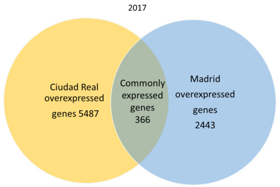 A total of 666,180 genes were identified in 2017 after sequencing, mapping alignment, normalized expression, and differential expression, but 550,285 genes in 2017 were not available for the study, since the fold change and p adjust value were not obtained in the normalized expression analysis. A total of 115,895 genes were available for the genetic expression analysis, of which 107,599 had a p adjust value over 0.05. When the pollen of the two cities was compared, the expression pattern showed that in 2017, 366 genes were common to both cities (expression without significant differences), and 2443 genes were significantly overexpressed in the pollen from Madrid, while 5487 genes were significantly overexpressed in Ciudad Real (Figure 1).