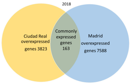 A total of 666,181 genes were identified in 2018 after sequencing, mapping alignment, normalized expression, and differential expression, but 585,368 genes were not available for the study, since the fold change and p adjust value were not obtained in the normalized expression analysis. A total of 80,813 genes resulted as available for the genetic expression analysis, of which 69,239 had a p adjust value over 0.05. When the pollen of the two cities was compared, the expression pattern showed that in 2018, 163 genes were common to both cities (expression without significant differences), and 7568 genes were significantly overexpressed in the pollen from Madrid, while 3823 genes were significantly overexpressed in Ciudad Real (Figure 2).