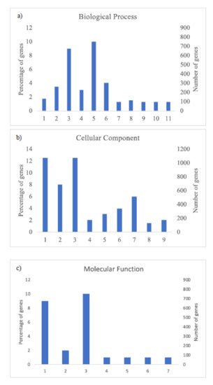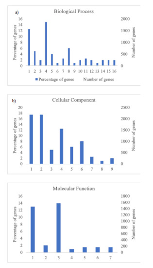 Histogram of GO classifications of L. perenne pollen in samples of 2018. Results are summarized for the three main categories: (a) Biological process: 1. Metabolic process, 2. Biological regulation, 3. Multi-organism process, 4. Cellular process, 5. Regulation of biological process, 6. Negative regulation of biological process, 7. Localization, 8. Response to stimulus, 9. Immune system process, 10. Signaling, 11. Cellular component organization or biogenesis, 12. Developmental process, 13. Positive regulation of biological process, 14. Multicellular organismal process, 15. Reproductive process, 16. Reproduction; (b) cellular component: 1. Cell, 2. Cell part, 3. Organelle part, 4. organelle, 5. Membrane part, 6. Membrane, 7. Protein-containing complex, 8. Membrane-enclosed lumen, 9. Extracellular region; and (c) molecular function: 1. Catalytic activity, 2. Transporter activity, 3. Binding, 4. Molecular transducer activity, 5. Molecular function regulator, 6. Structural molecule activity, 7. Transcription regulator activity.