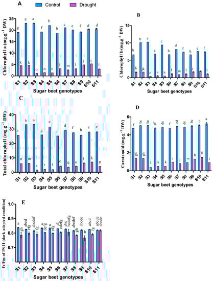 Chlorophyll a (A), Chlorophyll b (B), Total chlorophyll (C), Carotenoid (D), and Quantum yield (E) of 11 genotypes of sugar beet (Beta vulgaris L.) under control and drought conditions. Values are expressed as mean ± S.E. (n = 3). Different letters indicate significant differences (p < 0.05) among the genotypes within each parameter using Duncan’s multiple range test.