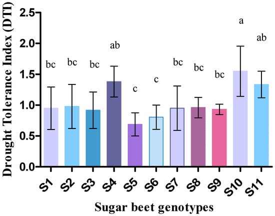 Drought tolerance index of 11 genotypes of sugar beet (Beta vulgaris L.) under control and drought conditions. Values are expressed as mean ± S.E. (n = 3). Different letters indicate significant differences (p < 0.05) among the genotypes within each parameter using Duncan’s multiple range test.