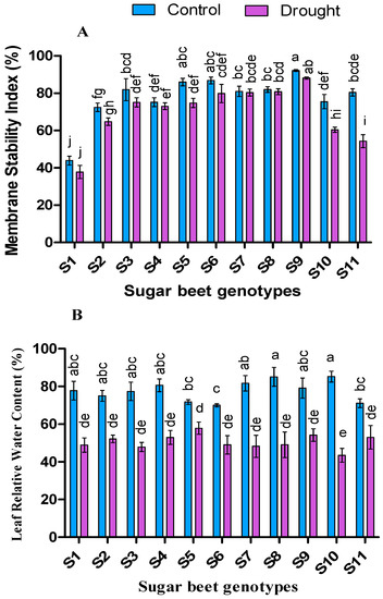 RWC is one of the most important and reliable physiological indices by which assist to evaluate a particular genotype whether it is drought tolerant or not [69,82]. As shown in Figure 4, despite the reduction of RWC in all the genotypes under drought stress condition, the genotypes S2, S4, S5, S9, and S11 exposed as higher RWC with minimum loss (30%, 34%, 19.35%, 31.4%, and 25.4% respectively) compare to others. This higher RWC may be caused due to stomatal closure induced by stress, resulting reduction of transpiration [83,84]. To maintain cell integrity and proper functioning, the stability of cell membrane lipidome is an important index in a growing plant [85]. Like RWC, a higher membrane stability index (MSI) of tolerant genotypes may be due to reduced transpiration and efflux of solutes that are involved in the osmoregulation process of plant leaves [86]. In the present experiment the genotypes S3, S6, and S9 demonstrated strong MSI in drought conditions compared to control. Evidence showed that protecting the cell membrane helps from reducing sugar beet root yield under drought stress in different genotypes [87]. Thus, the genotypes with higher MSI under drought condition may be considered as tolerant plants.