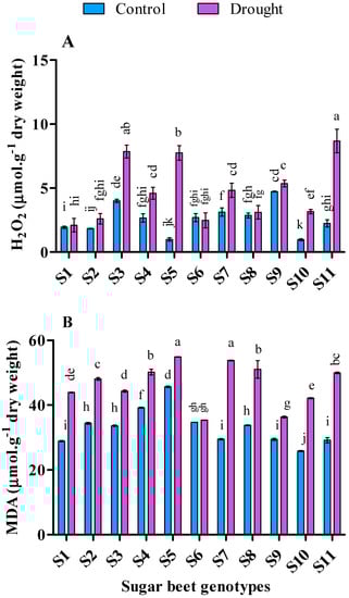 Hydrogen peroxide (A) and malondialdehyde content (B) of 11 genotypes of sugar beet (Beta vulgaris L.) under control and drought conditions. Values are expressed as mean ± S.E. (n = 3). Different letters indicate significant differences (p < 0.05) among the genotypes within each parameter using Duncan’s multiple range test.