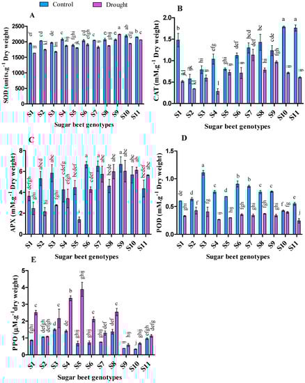 Activities of superoxide dismutase (SOD) (A), catalase (CAT) (B), ascorbate peroxidase (APX) (C), peroxidase (POD) (D), and polyphenol oxidase (PPO) (E) enzymes of 11 genotypes of sugar beet (Beta vulgaris L.) under control and drought conditions. Values are expressed as mean ± S.E. (n = 3). Different letters indicate significant differences (p < 0.05) among the genotypes within each parameter using Duncan’s multiple range test.